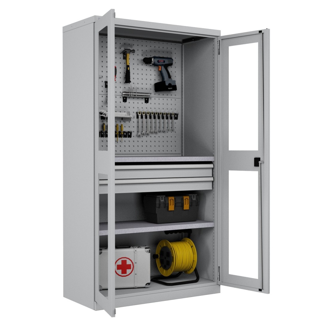 ARMADIO INDUSTRIALE OFFICINA METALLO PORTE BATTENTE PLEXIGLAS CON PANNELLI FORATI 2 CASSETTI L. 103 x P. 55 x H. 200 cm. MONTATO