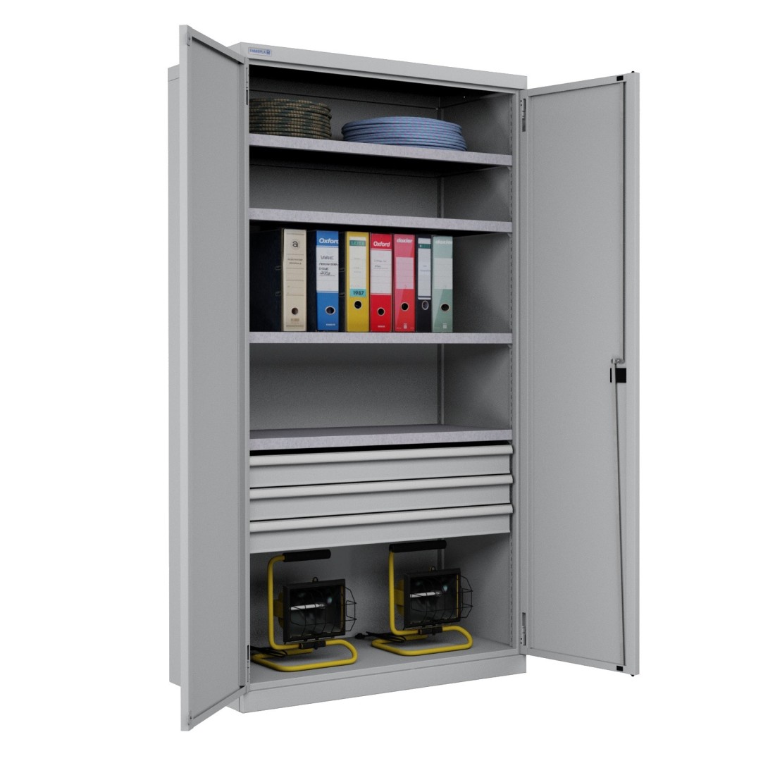 ARMADIO INDUSTRIALE OFFICINA METALLO PORTE BATTENTE CON 3 CASSETTI L. 103 x P. 55 x H. 200 cm. MONTATO