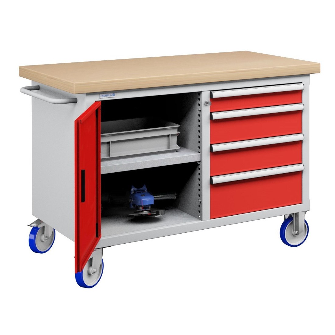 Bancone con ruote da lavoro in lamiera d'acciaio saldata e verniciata con prodotti di alta qualità e basso impatto ambientale, piano in multistrato di faggio. Possibilità di configurarlo con copertura di acciaio rivestita in gomma antiolio. Struttura monoblocco con fessurazione a passo 25 mm dei montanti interni per il posizionamento di piani e cassetti.