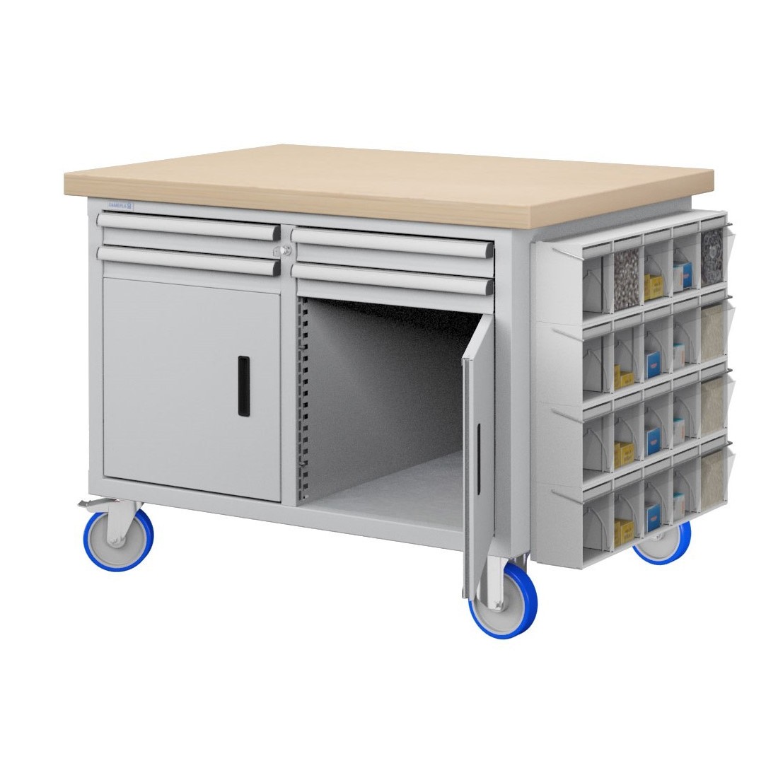 Bancone con ruote ad alta portata con 4 cassetti e 2 ante + 4 file Unibox da 5 cassetti laterali cod UN60507
