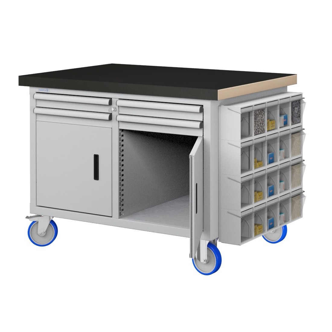 Bancone con ruote ad alta portata con 4 cassetti e 2 ante + 4 file Unibox da 5 cassetti laterali cod UN60507