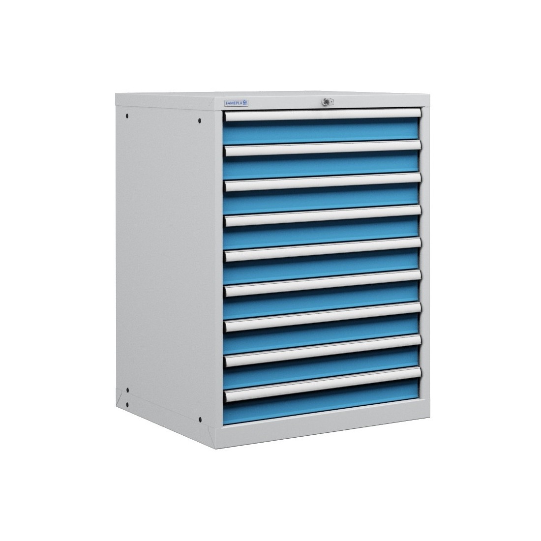 Gli interni dei cassetti sono fessurati nelle pareti ogni 17 millimetri e forati sulla base per alloggiare un'ampia gamma di kit divisori cassetto, comprese le partizioni di metallo, scatole di plastica, vassoi scanalati, vassoi pinza, porta fresa, inserti in spugna per l’alloggiamento degli utensili, tappetini antiscivolo ...