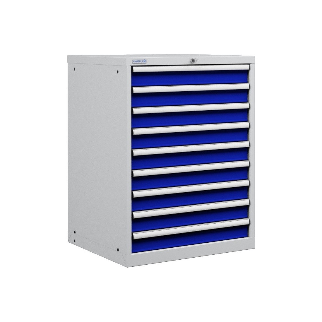 Gli interni dei cassetti sono fessurati nelle pareti ogni 17 millimetri e forati sulla base per alloggiare un'ampia gamma di kit divisori cassetto, comprese le partizioni di metallo, scatole di plastica, vassoi scanalati, vassoi pinza, porta fresa, inserti in spugna per l’alloggiamento degli utensili, tappetini antiscivolo ...