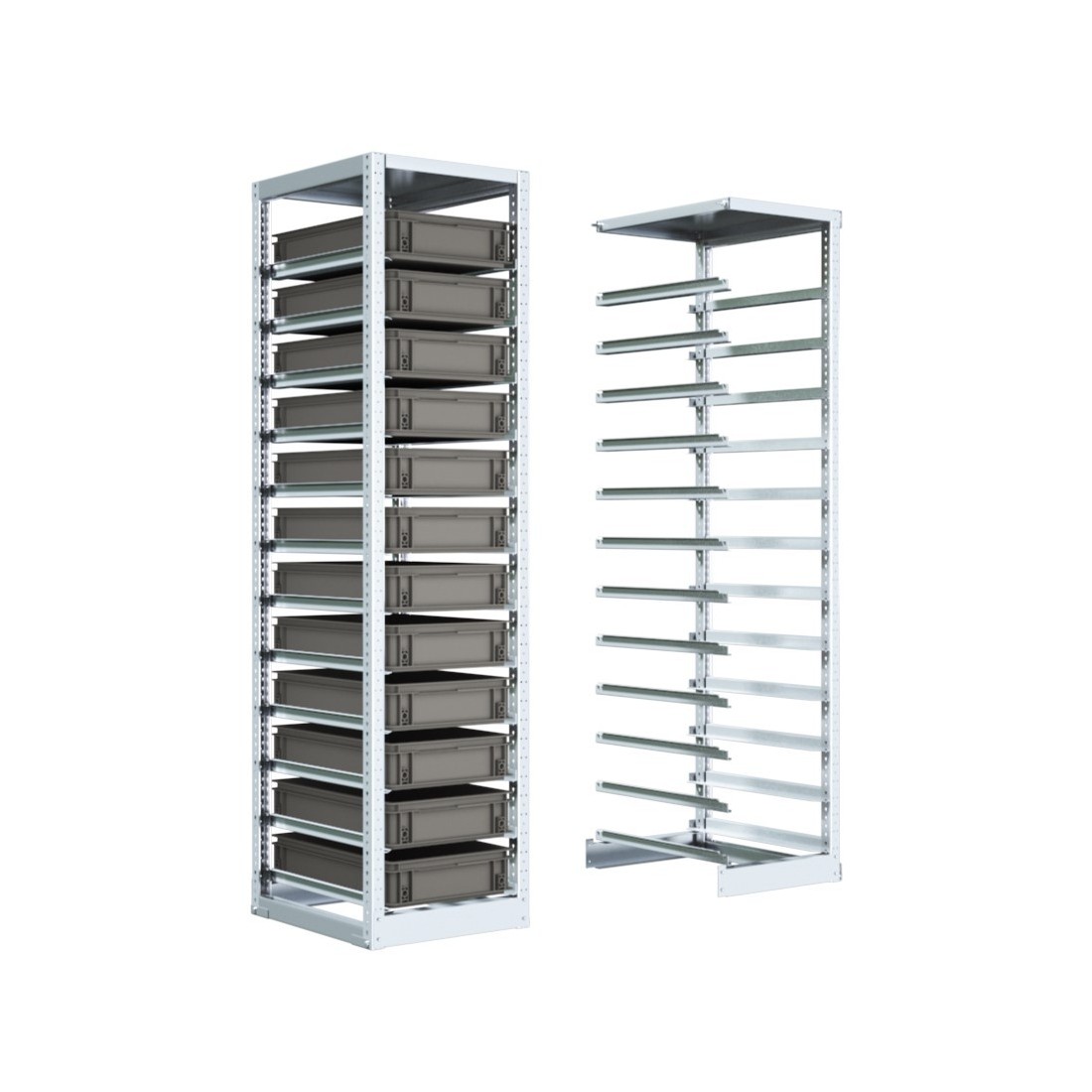 Le scaffalature sono disponibili in due altezze: 1100 mm e 2000 mm, ciascuna delle quali presenta due diverse combinazioni di larghezze e profondità, a seconda dei contenitori da inserire. Con l’impiego di scaffali aggiuntivi è possibile collegare una nuova campata a quella esistente, risparmiando lo spazio e il costo di un montante.