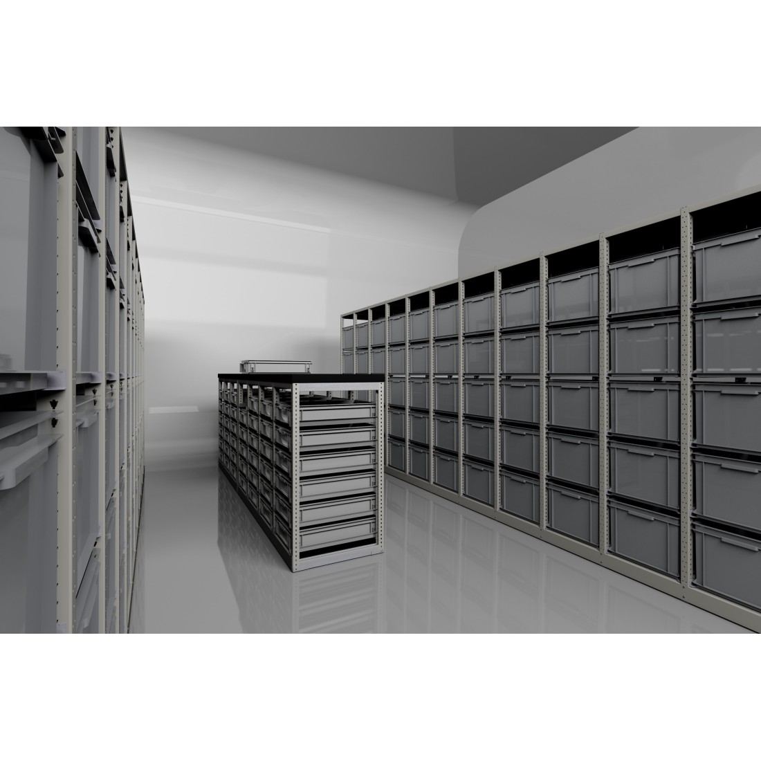 Le scaffalature sono disponibili in due altezze: 1100 mm e 2000 mm, ciascuna delle quali presenta due diverse combinazioni di larghezze e profondità, a seconda dei contenitori da inserire. Con l’impiego di scaffali aggiuntivi è possibile collegare una nuova campata a quella esistente, risparmiando lo spazio e il costo di un montante.