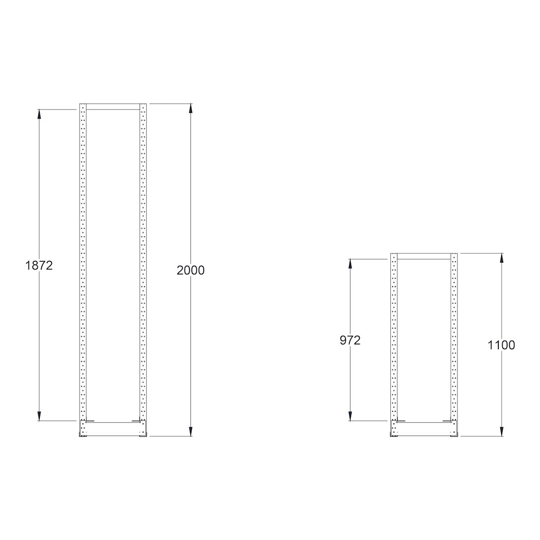 Le scaffalature sono disponibili in due altezze: 1100 mm e 2000 mm, ciascuna delle quali presenta due diverse combinazioni di larghezze e profondità, a seconda dei contenitori da inserire. Con l’impiego di scaffali aggiuntivi è possibile collegare una nuova campata a quella esistente, risparmiando lo spazio e il costo di un montante.