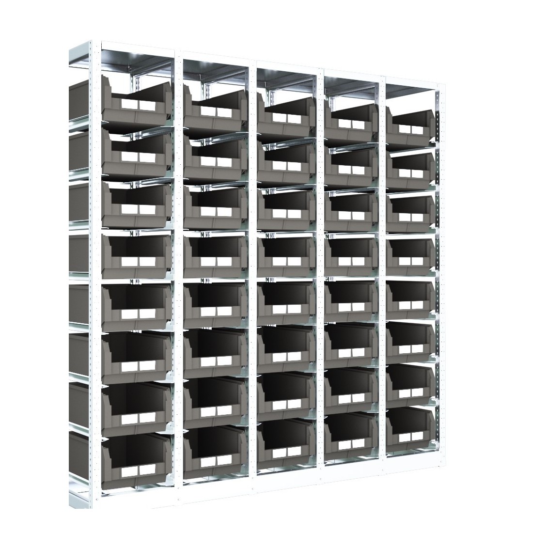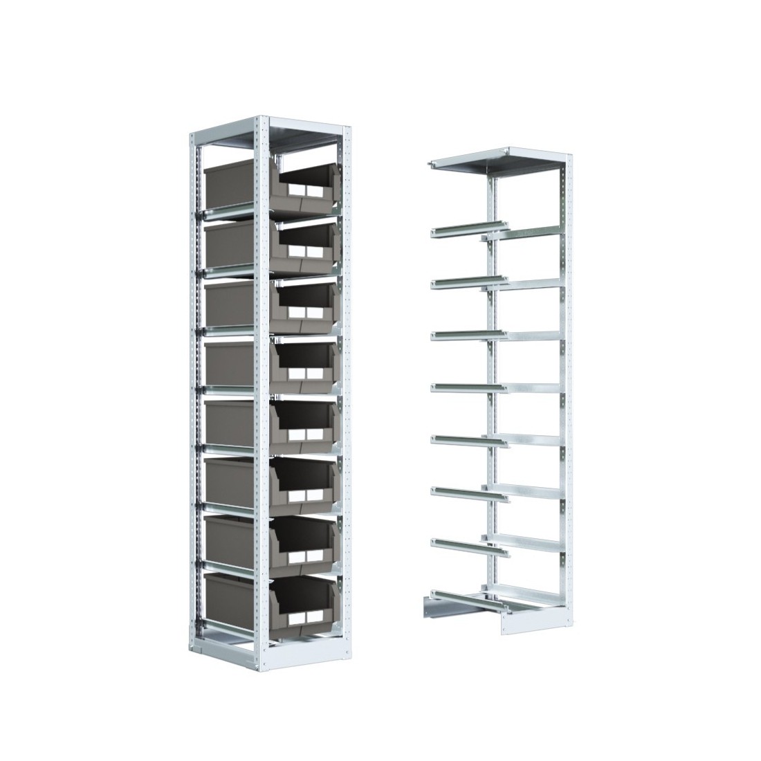 Strutture modulari per il contenimento dei contenitori serie COMPAT con guide zincate dalla portata di 50 kg a coppia. Scaffali zincati con 2 dimensioni in altezza : 1100 e 2000 mm e 2 diverse larghezze e profondità in base alle dimensioni dei contenitori.