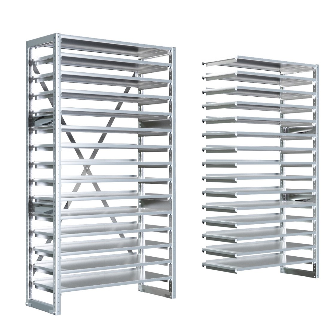 Strutture modulari per il contenimento dei contenitori serie RK. Scaffali zincati con 2 profondità in base alle dimensioni dei contenitori: 625 mm per alloggiare cassette profondità 600 e 500 mm lunghezza e 425 mm per alloggiare cassette profondità 400 e 300 mm. Con l’impiego di scaffali aggiuntivi è possibile collegare una nuova campata a quella esistente, risparmiando lo spazio e il costo di un montante.