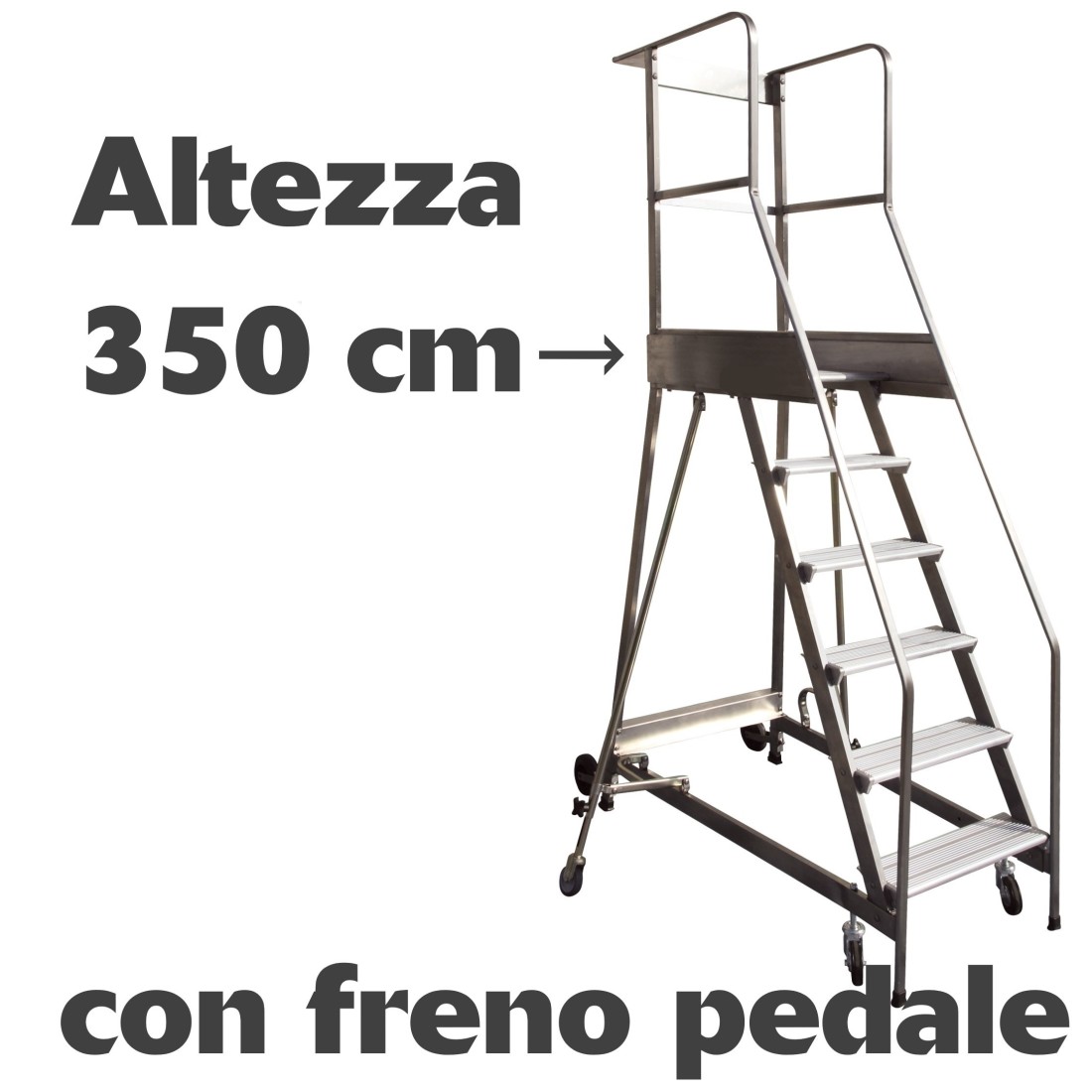 Scala a castello palchetto cimiteriale 14 SCALINI H 350 CM CON FRENO A PEDALE D.L. 81/2008 in acciaio INOX e alluminio