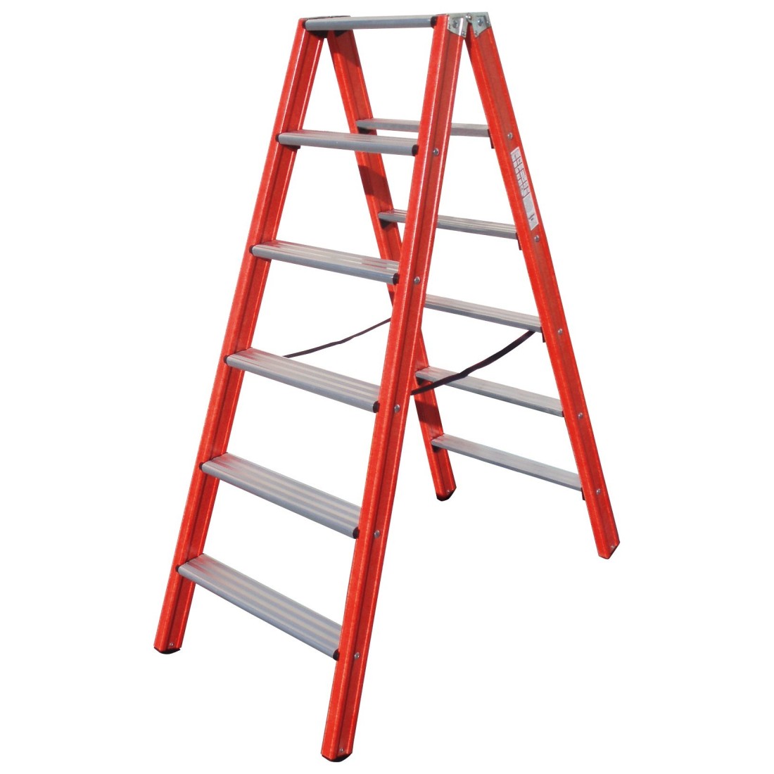 Scala per elettricisti doppia a due tronchi di salita, molto robusta, con montanti realizzati in fibra di vetro e gradini antiscivolo.