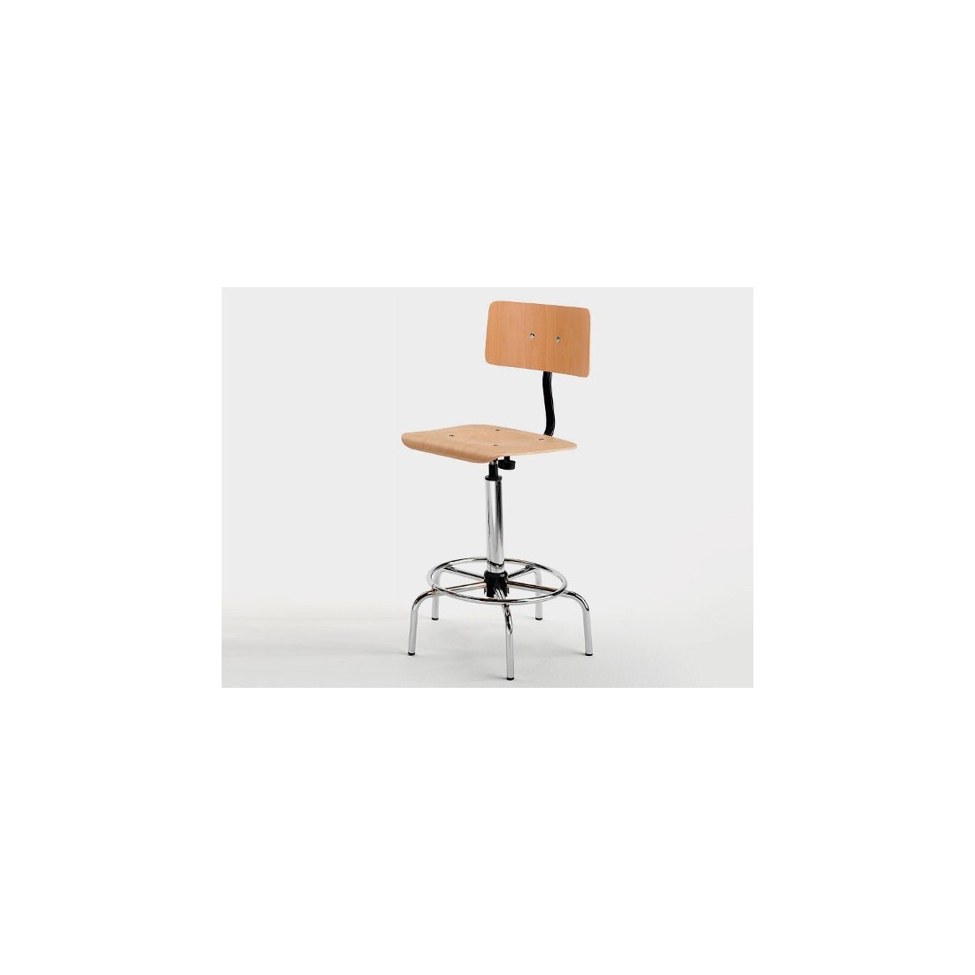 Sgabello con seduta e schienale in faggio, elevazione a vite o gas, base con poggiapiedi integrato in acciaio cromato.